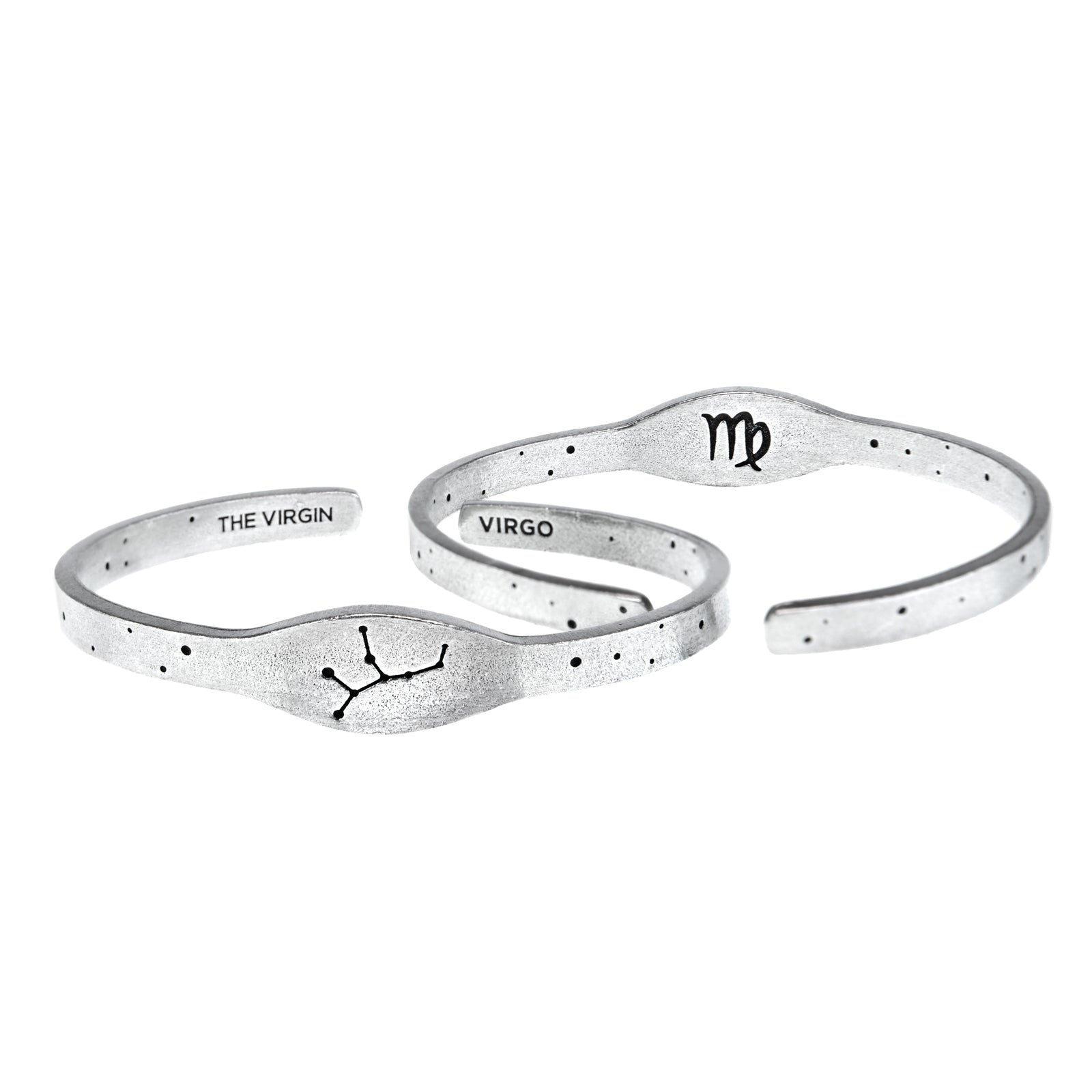 A Zodiac Cuff Bracelet is the perfect way to show off your unique personality. The Virgo sign is on the inside while the Virgo constellation is on the outside. The virgin is also inscribed on the inside. Recycled lead-free pewter Handcrafted Made in the U.S.A.